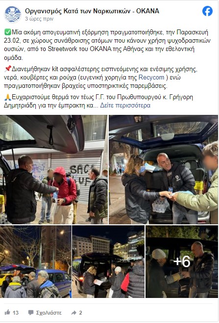 Μια ακόμα δράση της ομάδας Streetworκ του ΟΚΑΝΑ πραγματοποιήθηκε την περασμένη εβδομάδα, καθώς εθελοντική ομάδα βρέθηκε μαζί της σε χώρους συνάθροισης ατόμων που κάνουν χρήση ψυχοδραστικών ουσιών και μοίρασε kit ασφαλέστερης εισπνεόμενης και ενέσιμης χρήσης. Κατά τη διάρκεια της ίδιας δράσης πραγματοποιήθηκαν βραχείες υποστηρικτικές παρεμβάσεις, ενώ διανεμηθήκαν νερά, κουβέρτες και ρούχα.