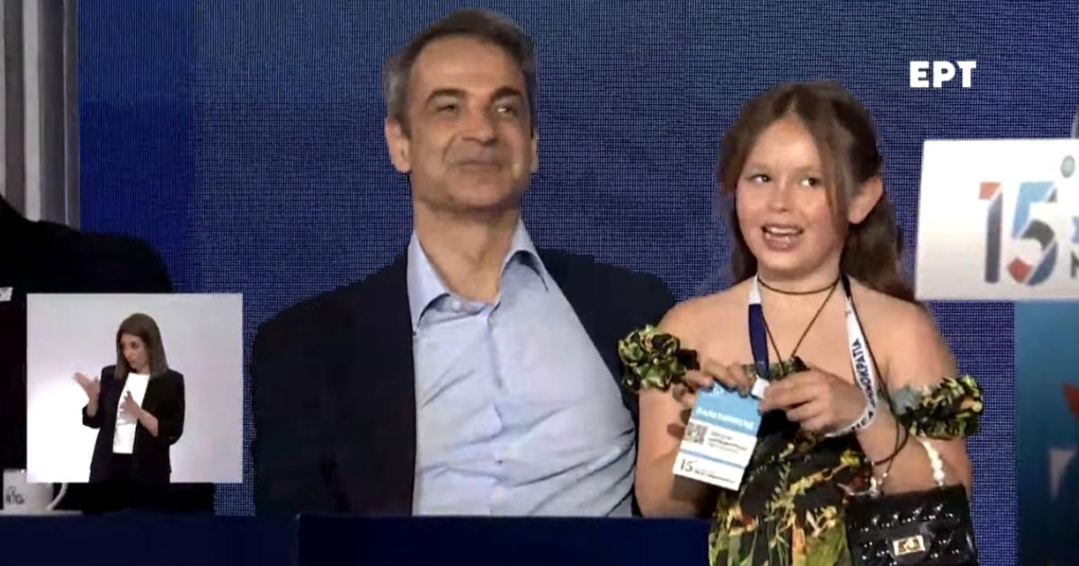 «Μιλάω και μου κλέβεις την παράσταση» είπε, χειροκροτώντας τη μικρή που κρατούσε μία κάρτα διαπίστευσης. τη συνέχεια, τη ρώτησε: «Μπορώ να συνεχίσω με την άδειά σου;». Τόσο το κοριτσάκι όσο και ο κ. Μητσοτάκης έγνεψαν καταφατικά.