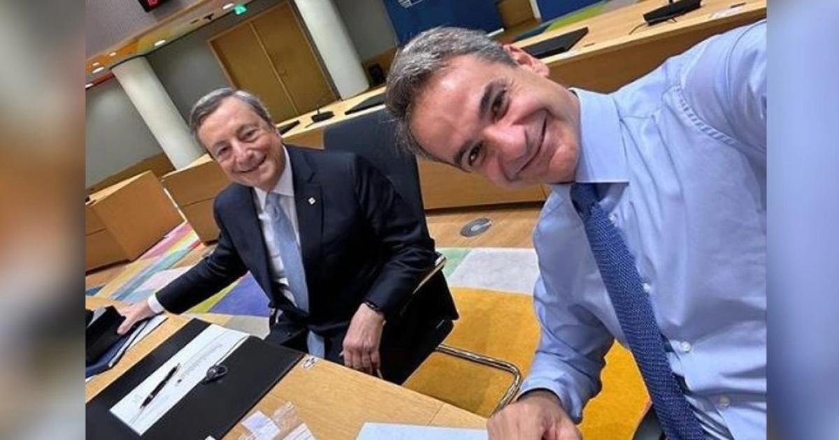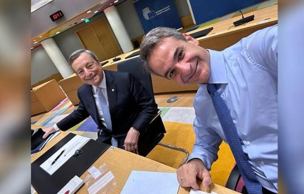Μία selfie φωτογραφία στην οποία απεικονίζεται ο ίδιος και ο Πρωθυπουργός της Ιταλίας, Μάριο Ντράγκι, να κάθονται δίπλα - δίπλα στο τραπέζι της Συνόδου Κορυφής της Ευρωπαϊκής Ένωσης ανάρτησε στον λογαριασμό του στο Instagram ο Κυριάκος Μητσοτάκης.