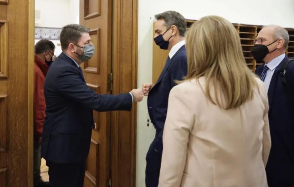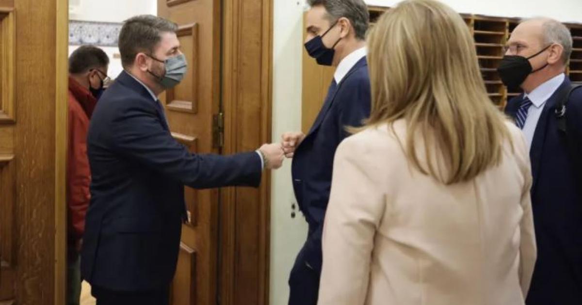 Ένα ολιγόλεπτο τετ α τετ είχαν στη Βουλή, έξω από την αίθουσα των κοινοβουλευτικων συντακτών ο πρωθυπουργός Κυριάκος Μητσοτάκης με τον νεοεκλεγέντα πρόεδρο του ΚΙΝΑΛ, Νίκο Ανδρουλάκη.