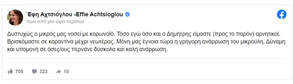 Αναλυτικά η ανάρτηση της Έφης Αχτσιόγλου αναφέρει: «Δυστυχώς ο μικρός μας νοσεί με κορωνοϊό. Τόσο εγώ όσο και ο Δημήτρης είμαστε (προς το παρόν) αρνητικοί. Βρισκόμαστε σε καραντίνα μέχρι νεωτέρας. Μόνη μας έγνοια τώρα η γρήγορη ανάρρωση του μικρούλη. Δύναμη και υπομονή σε όσες/ους περνάνε δύσκολα και καλή ανάρρωση».