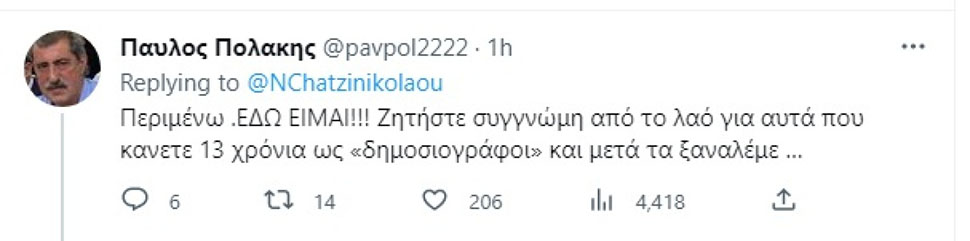 Λίγο μετά τα μεσάνυχτα, ο Πολάκης έκανε την εμφάνισή του και απάντησε στον Χατζηνικολάου, καλώντας τον να ζητήσει συγγνώμη από τον λαό. «Περιμένω. ΕΔΩ ΕΙΜΑΙ!!! Ζητήστε συγγνώμη από το λαό για αυτά που κανετε 13 χρόνια ως «δημοσιογράφοι» και μετά τα ξαναλέμε…» έγραψε ο κ. Πολάκης.
