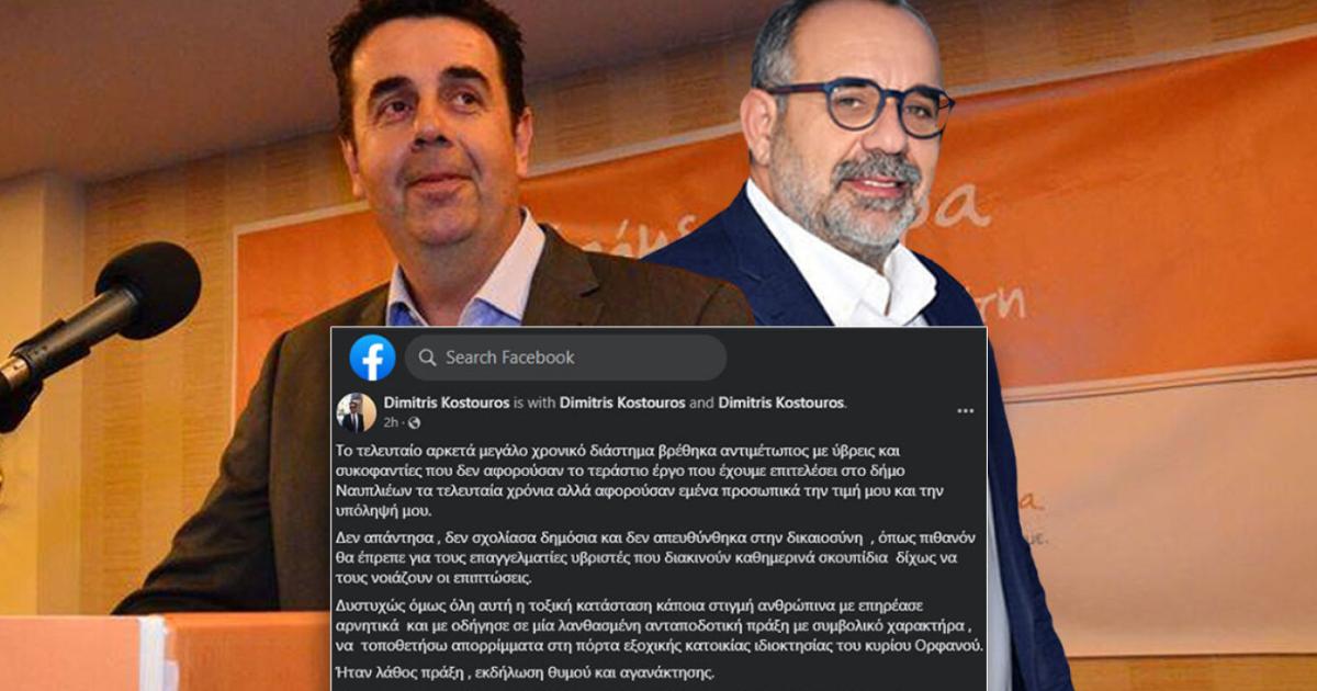 Στην ανάρτηση του ο Δημήτρης Κωστούρος, αναφέρει: «Το τελευταίο αρκετά μεγάλο χρονικό διάστημα βρέθηκα αντιμέτωπος με ύβρεις και συκοφαντίες που δεν αφορούσαν το τεράστιο έργο που έχουμε επιτελέσει στο δήμο Ναυπλιέων τα τελευταία χρόνια αλλά αφορούσαν εμένα προσωπικά την τιμή μου και την υπόληψή μου. Δεν απάντησα , δεν σχολίασα δημόσια και δεν απευθύνθηκα στην δικαιοσύνη , όπως πιθανόν θα έπρεπε για τους επαγγελματίες υβριστές που διακινούν καθημερινά σκουπίδια δίχως να τους νοιάζουν οι επιπτώσεις. Δυστυχώς όμως όλη αυτή η τοξική κατάσταση κάποια στιγμή ανθρώπινα με επηρέασε αρνητικά και με οδήγησε σε μία λανθασμένη ανταποδοτική πράξη με συμβολικό χαρακτήρα , να τοποθετήσω απορρίμματα στη πόρτα εξοχικής κατοικίας ιδιοκτησίας του κυρίου Ορφανού. Ήταν λάθος πράξη , εκδήλωση θυμού και αγανάκτησης. Προχωρώ μπροστά , με τα λάθη και τις παραλείψεις μου , τώρα ακόμα πιο δυνατά!».
