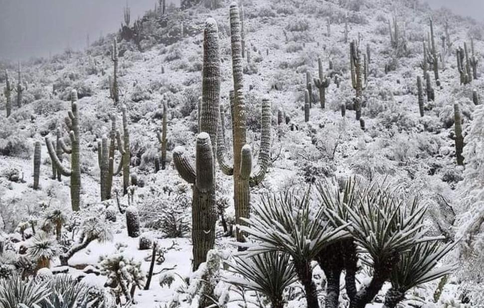 Χιονοπτώσεις στην έρημο Sonora στο βόρειο Scottsdale στην Αριζόνα στις ΗΠΑ. Ασυνήθιστη θέα των κάκτων που καλύπτονται από χιόνι.