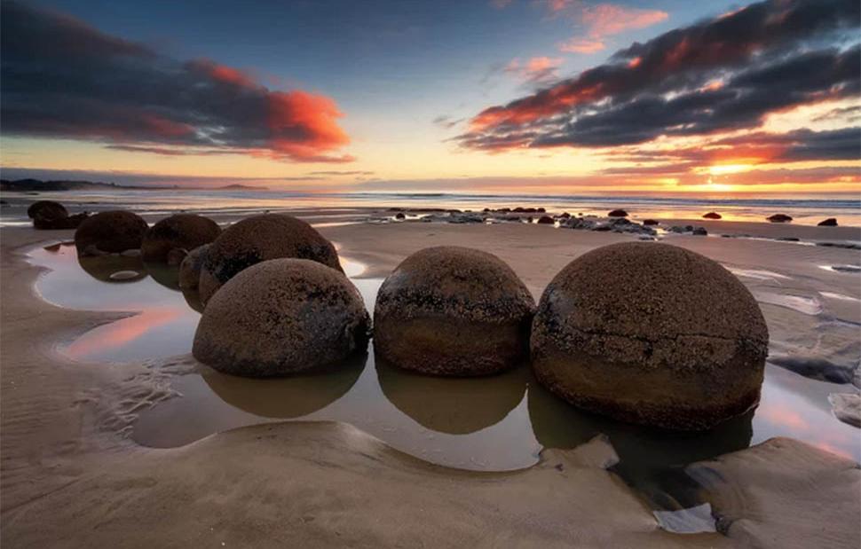 Οι μεγάλοι, σφαιρικοί ογκόλιθοι Moeraki θα μπορούσαν εύκολα να θεωρηθεί ότι είναι τεχνητές δημιουργίες που έχουν ξεβραστεί στην παραλία Koekohe στις ακτές του Βόρειου Οτάγκο.