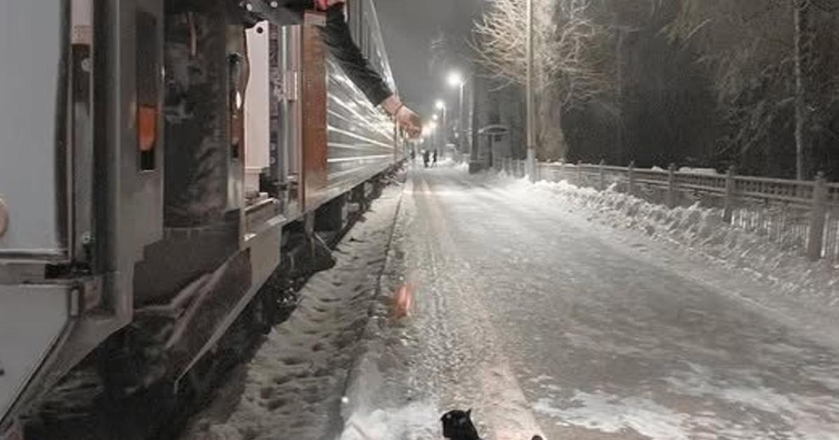 Ένας οδηγός τρένου ταΐζει μία γάτα σε μια σύντομη στάση.
