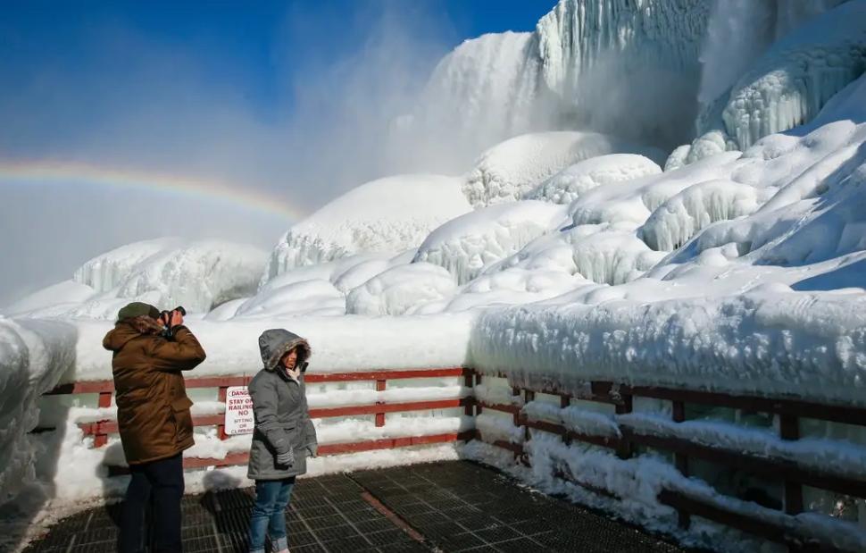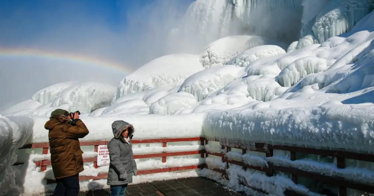 Επισκέπτες εξερευνούν έναν καταρράκτη κατά την διάρκεια μιας κρύας μέρας στο Τζαμού και Κασμίρ