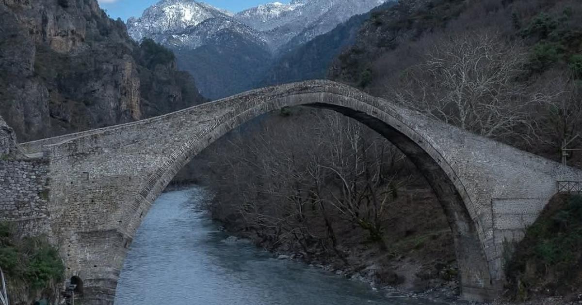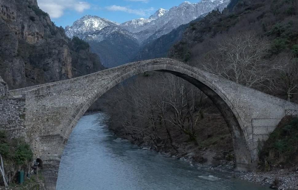 Ο Αώος, το γεφύρι της Κόνιτσας, και στο βάθος οι βουνοκορφές της Τύμφης.