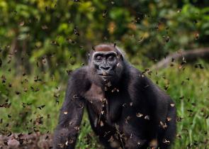 Ένα γορίλας , ο Μαλούι, περπατάει μέσα από ένα σύννεφο πεταλούδων στο Bai Hokou, ένα ειδικό δασικό καταφύγιο Dzanga Sangha στην Κεντροαφρικανική Δημοκ...