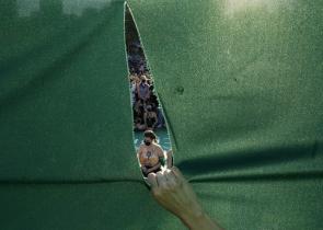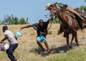 Ρέιντζερ της αμερικανικής συνοριοφυλακής με άλογο, προσπαθεί να σταματήσει έναν μετανάστη από την Αιτή από το να εισέλθει σε έναν καταυλισμό στις όχθε...