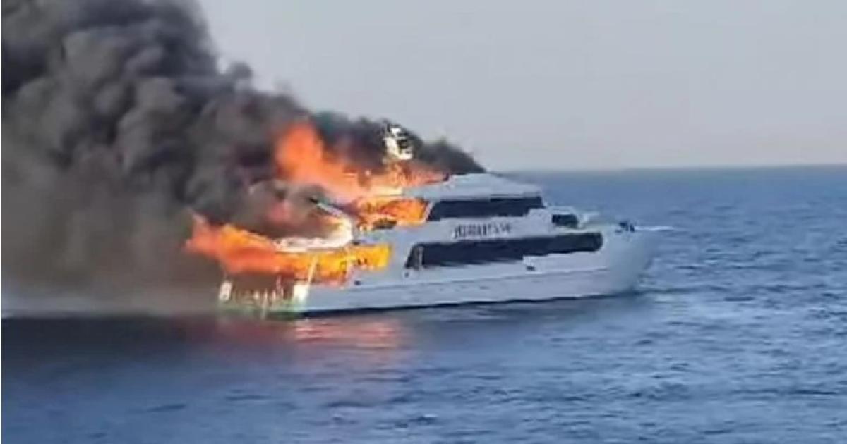Three British tourists are missing after a boat carrying 29 people caught fire off the coast of Egypt.