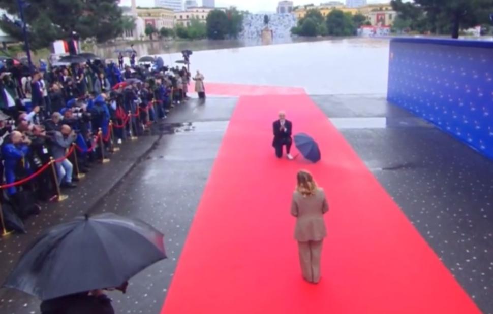 Ιδιαίτερη ήταν η υποδοχή του Πρωθυπουργού της Αλβανίας, Έντι Ράμα, στην Ιταλίδα ομόλογό του, Τζόρτζια Μελόνι, με γονάτισμα στο κόκκινο χαλί.