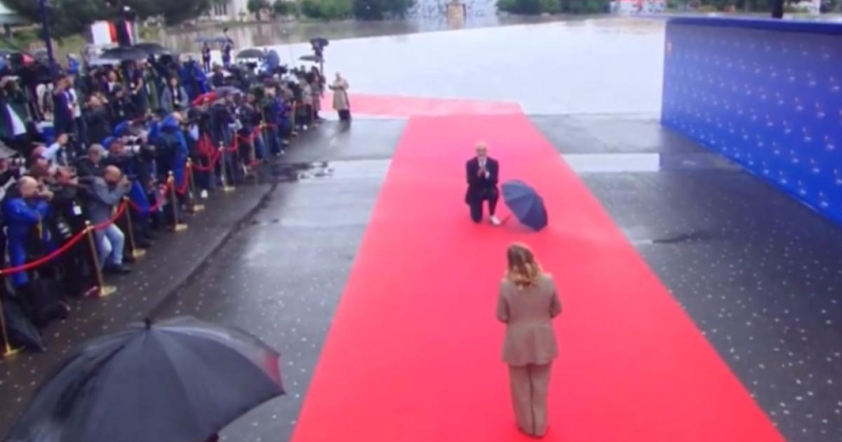 Η Τζόρτζια Μελόνι βγήκε από το αυτοκίνητό του και περπάτησε στο κόκκινο χαλί για να τον συναντήσει. Τότε, ο Έντι Ράμα απομάκρυνε την ομπρέλα του και γονάτισε μπροστά της.