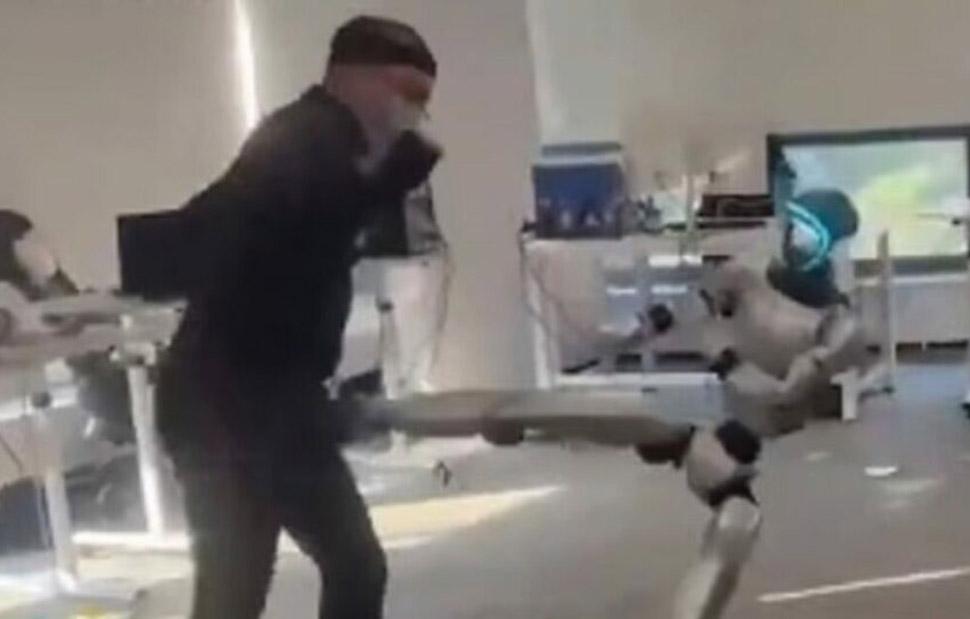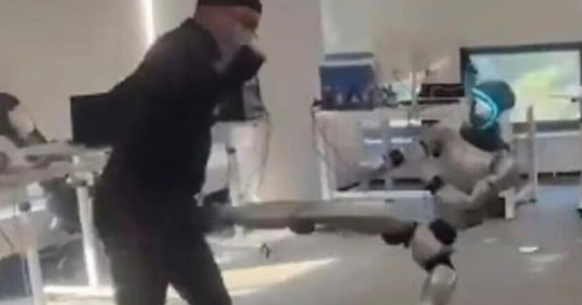 Το στιγμιότυπο δείχνει έναν άνδρα να δέχεται ένα εξαιρετικά οδυνηρό χτύπημα στη βουβωνική χώρα, όχι από άλλον άνθρωπο, αλλά από ένα ανθρωποειδές ρομπότ.