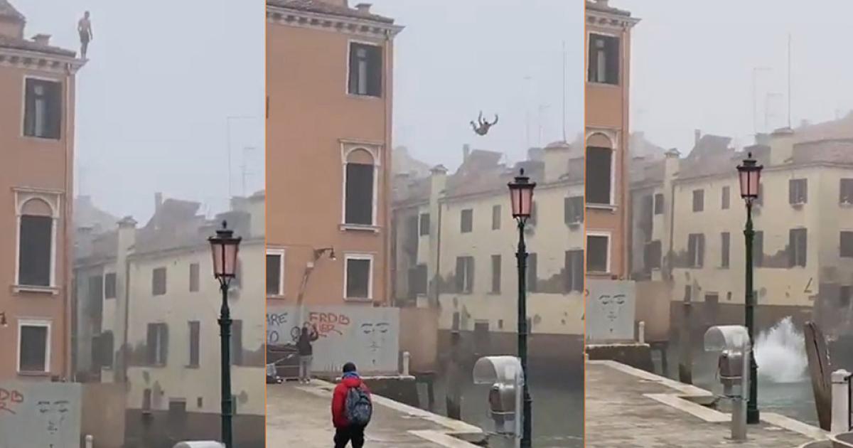 Ανθρωποκυνηγητό έχουν εξαπολύσει οι ιταλικές αρχές για τον εντοπισμό ενός άνδρα που δεν δίστασε να πηδήξει από ένα τριώροφο κτίριο σε κανάλι στη Βενετία, την περασμένη Πέμπτη. Το σχετικό βίντεο με τον άνδρα να πέφτει στο κανάλι έχει γίνει viral στα social media με τον δήμαρχο της Βενετίας, Λουίτζι Μπρουγκνάρο, να τον αποκαλεί ηλίθιο.