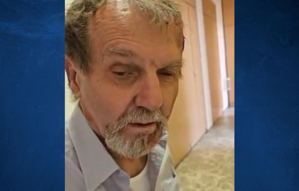 Ο Γιουράι Τσιντούλα βρίσκεται στον διάδρομο ενός κτιρίου, πιθανώς αστυνομικού τμήματος, και φαίνεται να έχει δεμένα τα χέρια πίσω από την πλάτη.