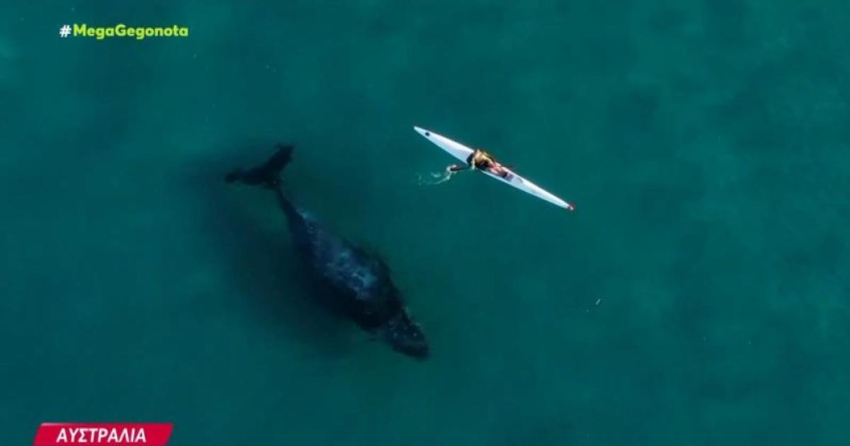 Στο βίντεο, που έχει γίνει viral, διακρίνεται η στιγμή που μία πελώρια μεγάπτερη φάλαινα κολυμπά σε «απόσταση αναπνοής» από ένα καγιάκ, προτού τελικώς αναδυθεί στην επιφάνεια του νερού.