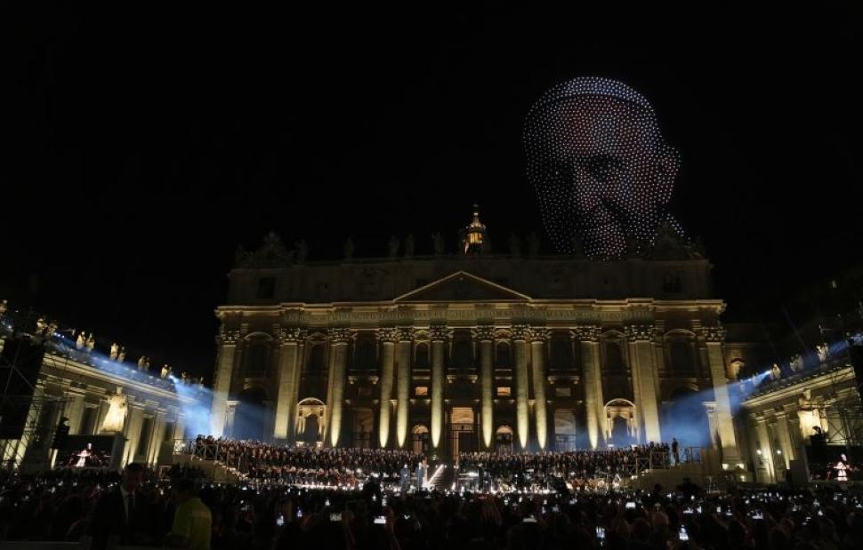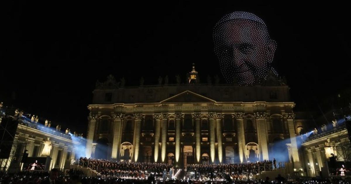 Το μεγάλο φινάλε της εκδήλωσης κορυφώθηκε με ένα εντυπωσιακό εναέριο θέαμα: 3.500 drones σχημάτισαν στον ουρανό το πρόσωπο του Πάπα Φραγκίσκου, την ώρα που στη σκηνή ακούγονταν οι νότες του Amazing Grace, σε ερμηνεία του Ιταλού τενόρου Andrea Bocelli και του Αμερικανού ράπερ Jelly Roll.