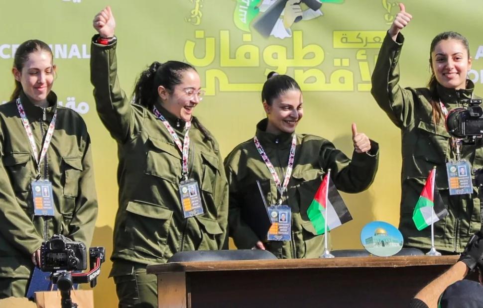 Η Χαμάς έντυσε τους τέσσερις στρατιώτες με χακί στολές για μια εξαιρετικά χορογραφημένη τελετή σε μια σκηνή σε μια πλατεία στο κέντρο της πόλης της Γάζας. Οι γυναίκες περικυκλώθηκαν από επίλεκτους μαχητές της Nukhba και πλήθος που ζητωκραύγαζε πετώντας κομφετί, πριν παραδοθούν στον Ερυθρό Σταυρό.