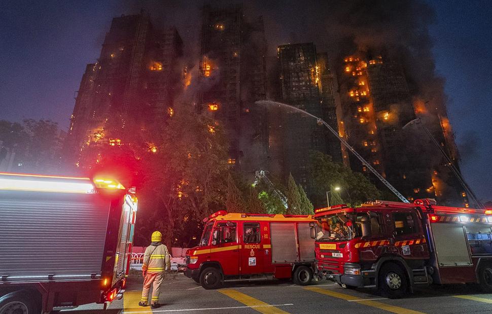 Η μαινόμενη πυρκαγιά εξαπλώθηκε στις σκαλωσιές από μπαμπού που είχαν στηθεί γύρω από το εξωτερικό του συγκροτήματος στην περιοχή Τάι Πο της πόλης.