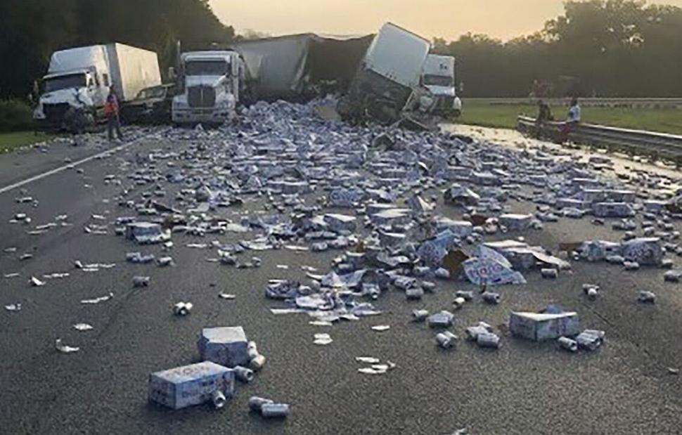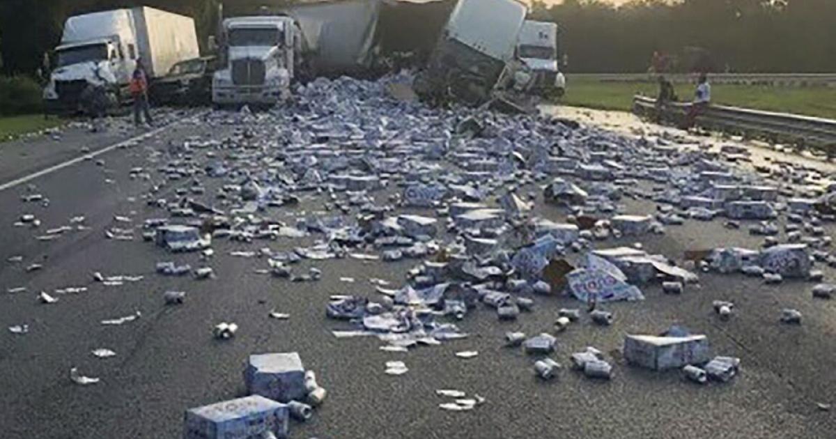 Όλες οι λωρίδες του αυτοκινητοδρόμου έκλεισαν. Οι φωτογραφίες που τράβηξε στο σημείο η τροχαία του Florida Highway δείχνουν τόσα χυμένα κουτιά μπίρας και χαρτόνια που με δυσκολία μπορεί κανείς να δει τον ίδιο τον δρόμο.