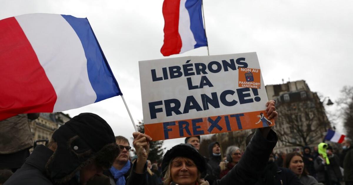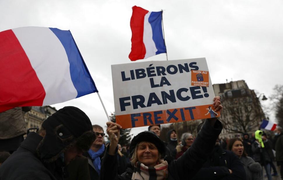 Άλλοι κρατούσαν πανό που έγραφαν «Όχι στο εμβολιαστικό πάσο», μια αναφορά στο νομοσχέδιο που προωθεί η κυβέρνηση Μακρόν βάσει του οποίου για να εισέλθει κάποιος στους περισσότερους δημόσιους χώρους θα πρέπει να επιδεικνύει πιστοποιητικό εμβολιασμού κατά της covid-19.