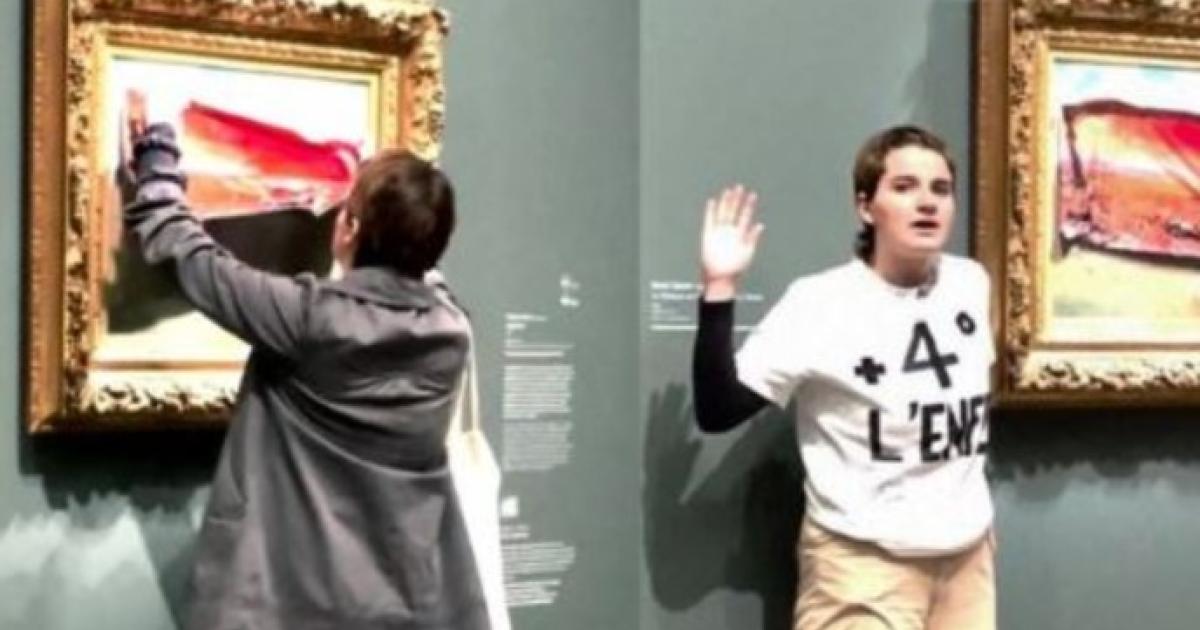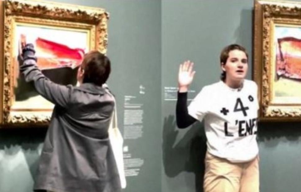 Βίντεο της οργάνωσης Riposte alimentaire, που ευθύνεται για σειρά επιθέσεων κατά έργων τέχνης, που αναρτήθηκε στο Χ δείχνει γυναίκα που παρουσιάζεται ως «στρατευμένη πολίτης» να κολλά στον ιμπρεσιονιστικό πίνακα που αποτυπώνει τοπίο με παπαρούνες ένα αυτοκόλλητο πόστερ με εικόνα αποκάλυψης σε κόκκινο χρώμα.