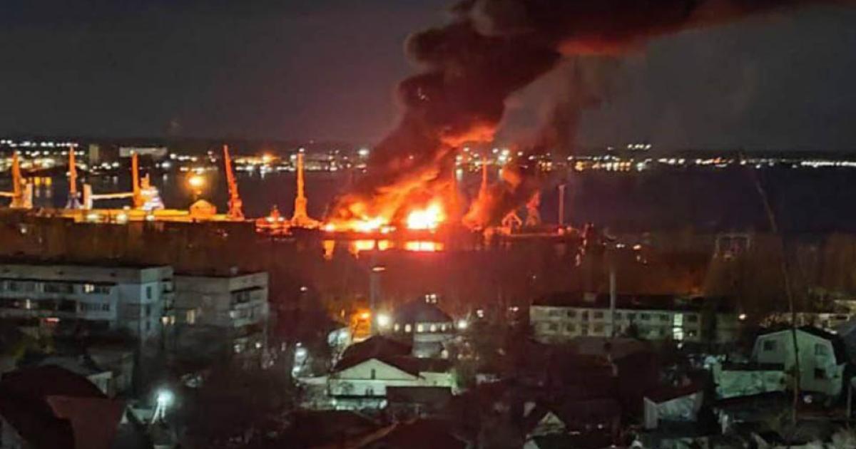 Several Large Explosions and Fires are raging at the Port in the Crimean City of Feodosia on the Coast of the Black Sea, following Ukrainian Strikes against what is reported to be Russian and Iran Naval Vessels carrying Munitions; the Ukrainian Air Force is claiming to have Sunk… pic.twitter.com/DHy3sTja3C