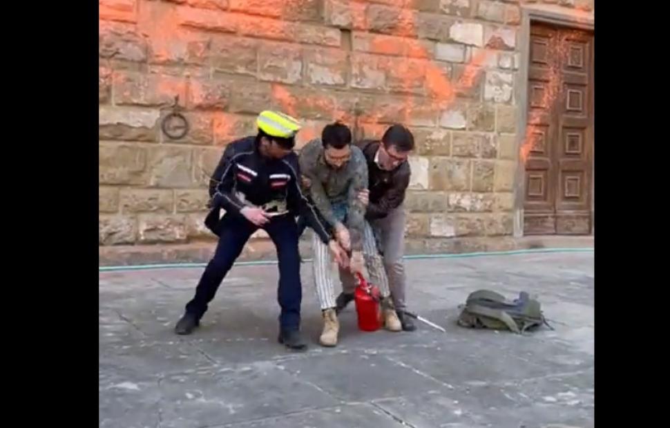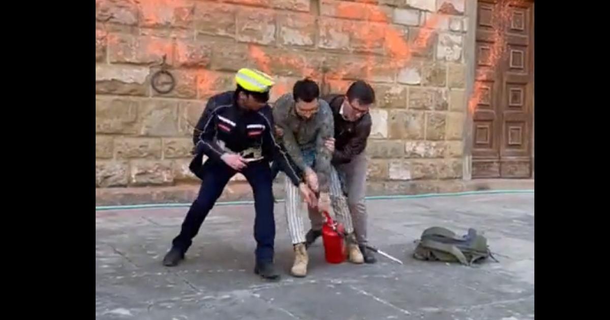 Οι στιγμές που κατέγραψαν με τις κάμερες από τη στιγμή που ο δήμαρχος της Φλωρεντίας επεμβαίνει και σταματά ακτιβιστή που βανδαλίζει με πορτοκαλί μπογιά το ιστορικό Palazzo Vecchio δεν άργησαν να γίνουν viral.