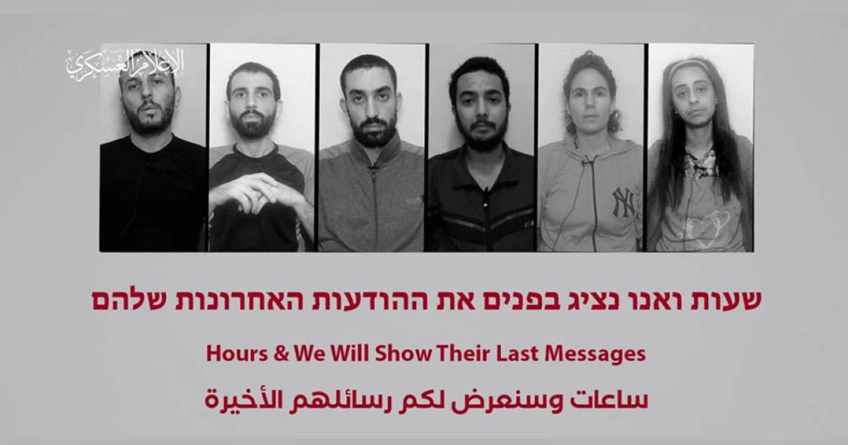 Στο βίντεο, που κυκλοφόρησε στο Telegram, οι όμηροι επιβεβαιώνουν την ταυτότητά τους, μιλώντας σε μία κάμερα. Το βίντεο κόβεται και η Χαμάς προειδοποιεί ότι θα δημοσιεύσει τα «τελευταία τους μηνύματα», πριν δολοφονηθούν.