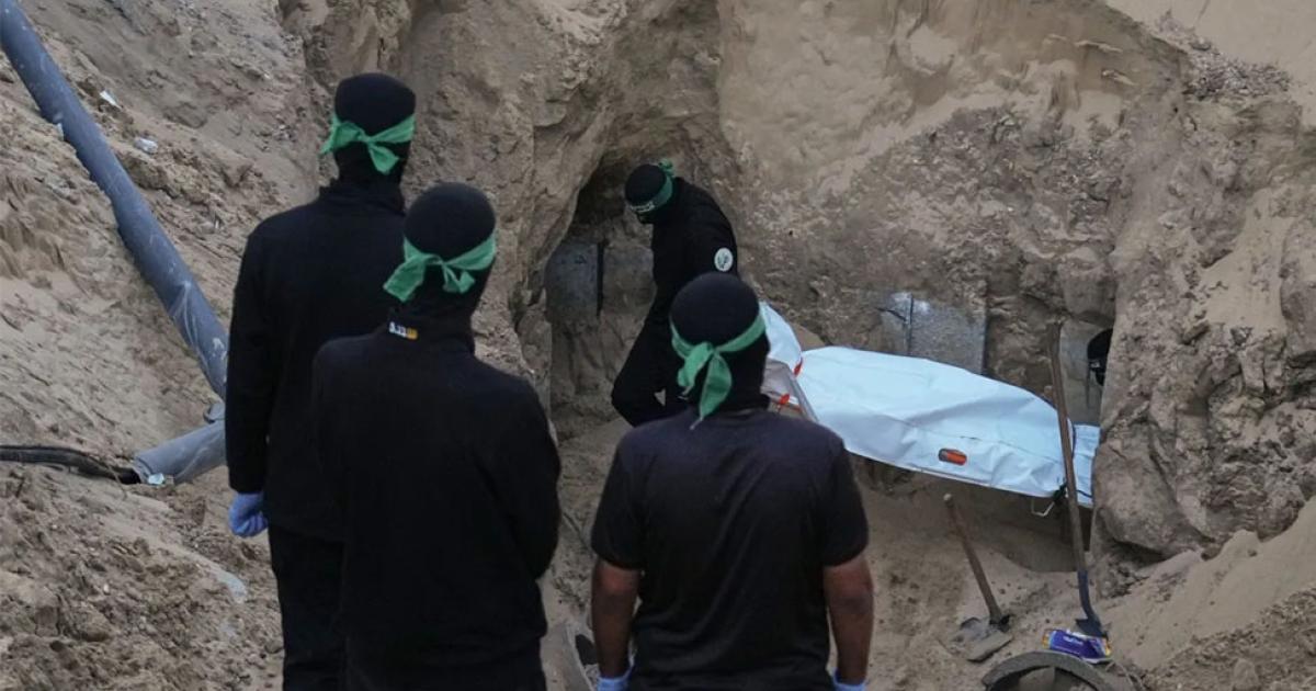 Yesterday, Hamas terrorists were filmed removing body remains from a prepared structure and re-burying them nearby, before summoning Red Cross representatives to stage a false “discovery” for photographers.