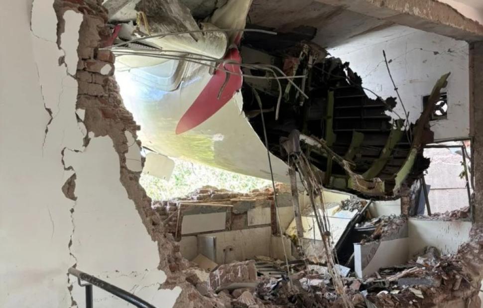 Όπως μπορεί να δει κανείς, τμήματα της ατράκτου του αεροπλάνου είναι σφηνωμένα στον ξενώνα, ενώ άνθρωποι στέκονται κοντά σε έναν γκρεμισμένο τοίχο και παρακολουθούν με τρόμο.