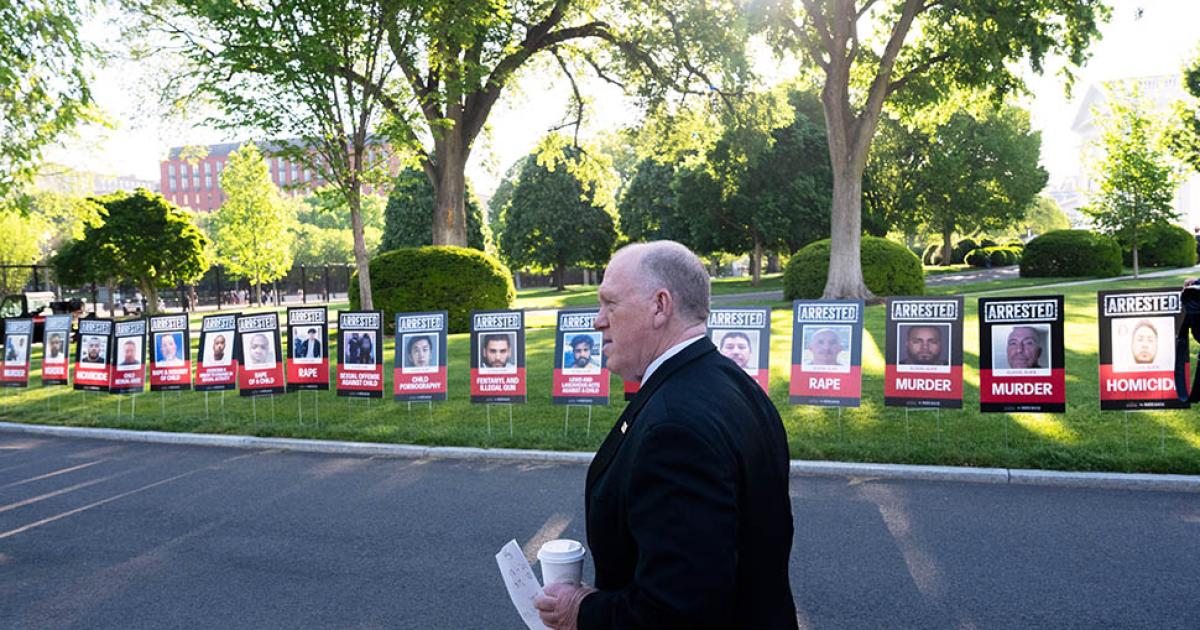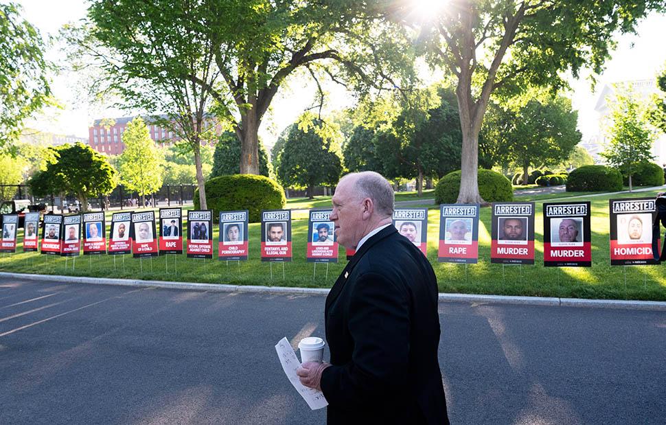 Η αμερικανική κυβέρνηση τοποθέτησε σήμερα, κατά μήκος του δρόμου που οδηγεί στον Λευκό Οίκο, τις φωτογραφίες 100 προσώπων που παρουσιάζονται ως παράτυποι μετανάστες, ένοχοι για διάφορα εγκλήματα και αδικήματα, οι οποίοι συνελήφθησαν μετά την επιστροφή του Ντόναλντ Τραμπ στον Λευκό Οίκο.