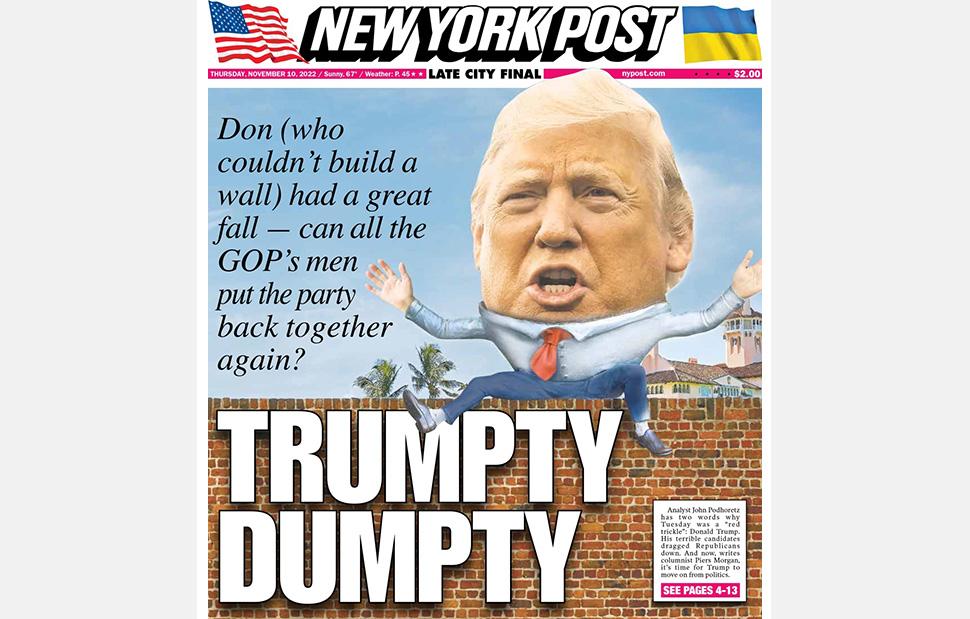 Με το «κόκκινο κύμα» να μένει στα χαρτιά, ο Ντόναλντ Τραμπ τέθηκε στο στόχαστρο ακόμα και παραδοσιακών του συμμάχων, όπως η εφημερίδα «New York Post» του Ρούπερτ Μέρντοκ. Στο πρωτοσέλιδό της, η εφημερίδα κάνει ένα λογοπαίγνιο με το όνομα του Ρεπουμπλικανού μεγιστάνα, χαρακτηρίζοντάς τον, ούτε λίγο ούτε πολύ, «χαζούλη» («Trumpty Dumpty»).