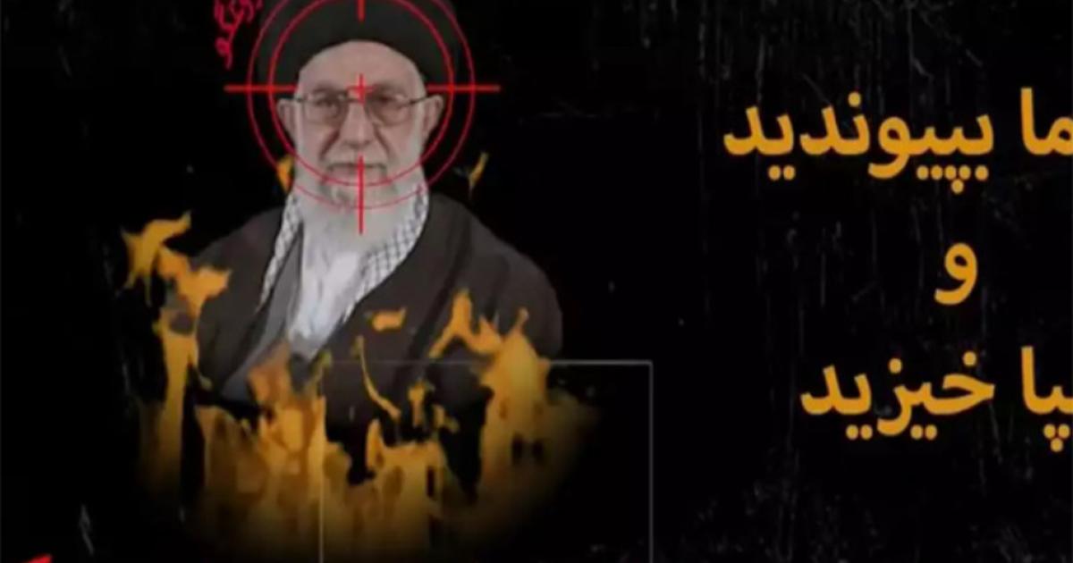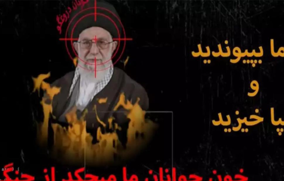 Ένας μασκοφόρος εμφανίστηκε στην οθόνη και αμέσως μετά μια φωτογραφία του Ανώτατου πνευματικού ηγέτη της χώρας Αλί Χαμενεϊ, περικυκλωμένο από φλόγες.