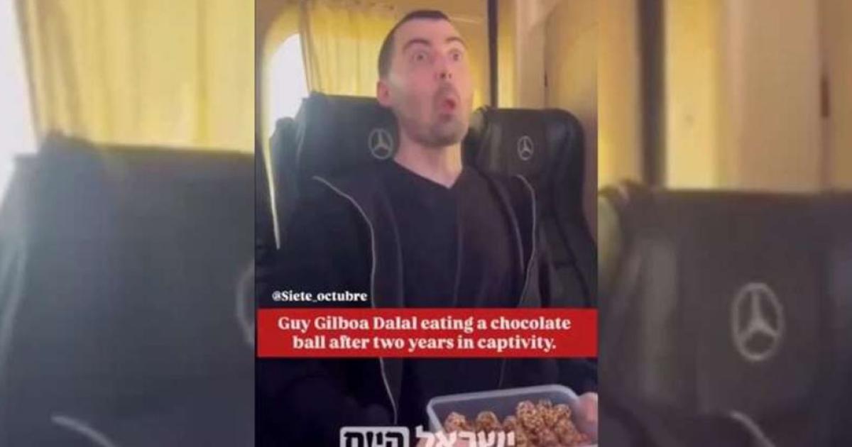 Η συγκλονιστική στιγμή καταγράφηκε σε βίντεο, όπου ο 24χρονος Guy Gilboa-Dalal, ελεύθερος πια, δοκιμάζει ένα μικρό κομμάτι σοκολάτας. Μια απλή αλλά ισχυρή «γεύση ελευθερίας».