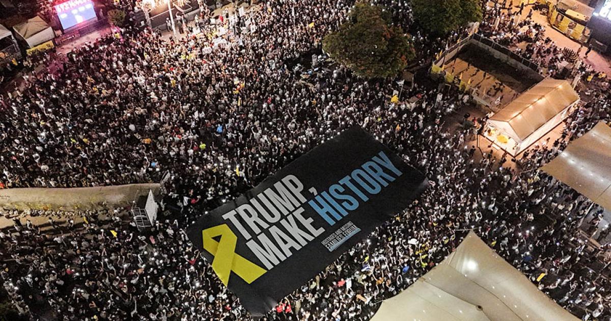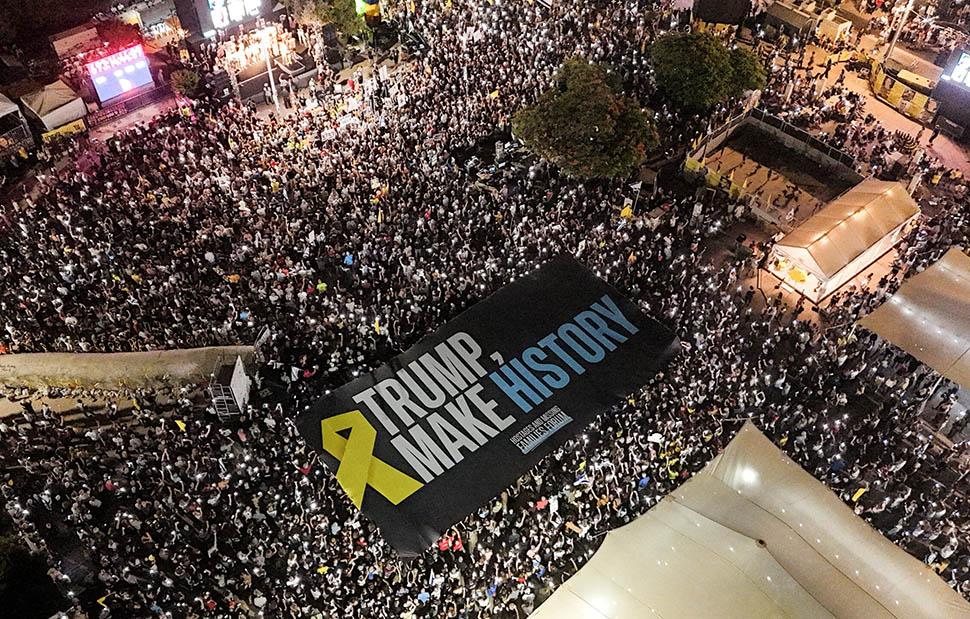 Ορισμένα μέλη οικογενειών των εναπομεινάντων ομήρων κάλεσαν τον Τραμπ να κάνει ό,τι περνάει από το χέρι του για να απελευθερώσει τους ομήρους, ξεδιπλώνοντας ένα μεγάλο πανό που έγραφε: «Τραμπ, γράψε ιστορία».