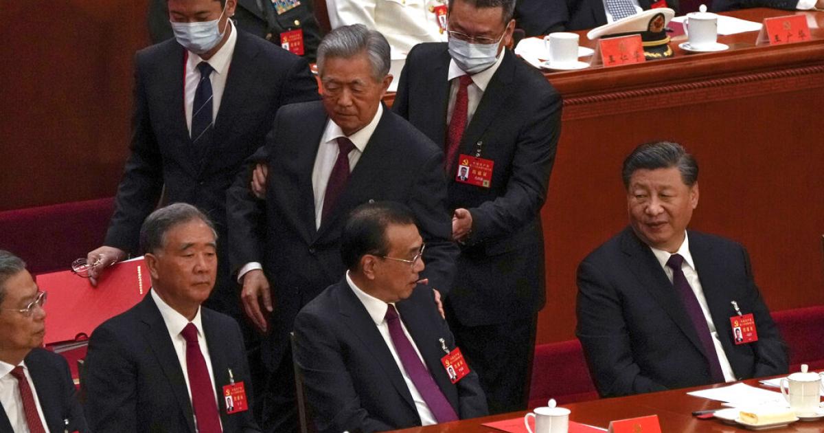 Η θέση του κατά την τελετή λήξης του Συνεδρίου ήταν δίπλα στον Σι Τζινπίνγκ στο Μέγαρο του Λαού. Στο οπτικό υλικό που έχει στην κατοχή του το AFP εμφανίζονται μέλη του προσωπικού να τον καλούν να σηκωθεί από την θέση του. Ενας υπάλληλος προσπαθεί να τον πιάσει από το χέρι, αλλά εκείνος αρνείται. Ο ίδιος άνθρωπος προσπαθεί να τον σηκώσει από τις μασχάλες, αλλά ο προκάτοχος του Σι Τζινπίνγκ, φανερά εξασθενημένος, συνεχίζει να αντιστέκεται.