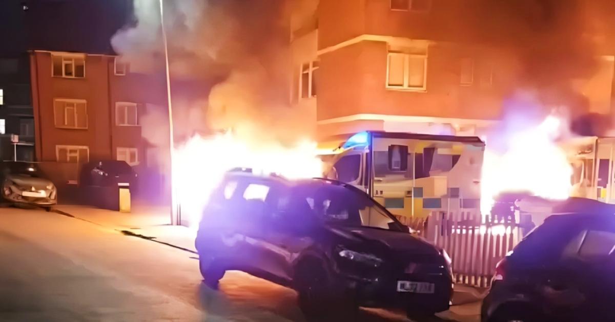 🚨 BREAKING FOOTAGE: Surveillance video captured 3 suspects on camera setting four ambulances in Golders Green, London, ablaze tonight.