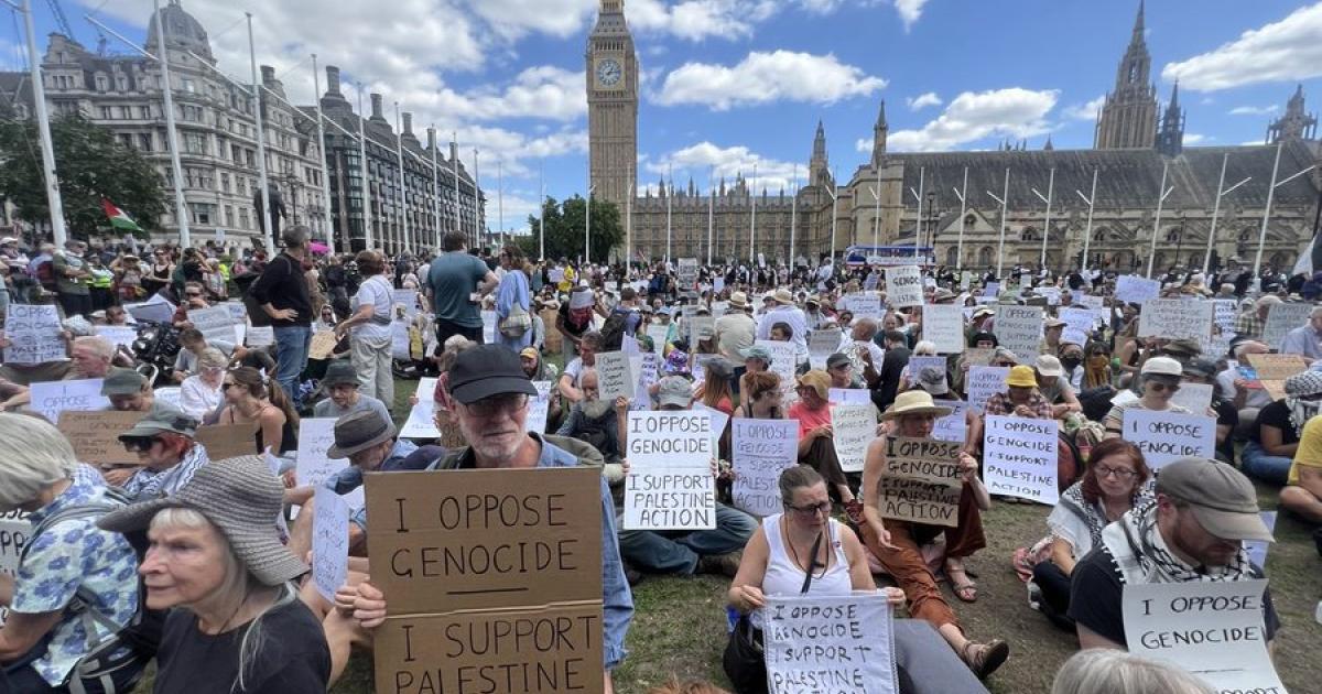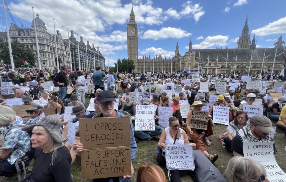 Όπως και τις προηγούμενες φορές, σήμερα Σάββατο, οι ακτιβιστές συγκεντρώθηκαν και σήμερα στη βρετανική πρωτεύουσα, στην πλατεία του κοινοβουλίου, μετά από κάλεσμα της οργάνωσης οργάνωση Defend Our Juries, και σε μία αιφνιδιαστική κίνηση αποκάλυψαν ταυτόχρονα χειρόγραφα πλακάτ με το ίδιο μήνυμα: «Αντιτίθεμαι στη γενοκτονία. Υποστηρίζω την Palestine Action»