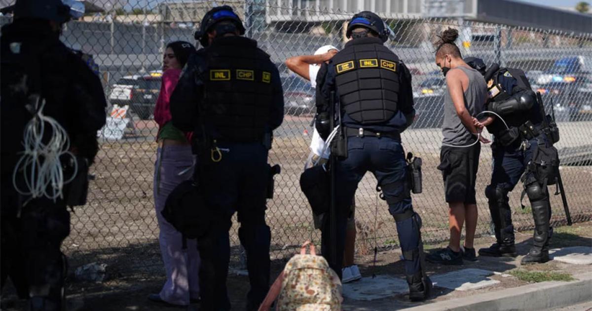 Κάπου 96 άνθρωποι προσήχθησαν προχθές Δευτέρα το βράδυ στο κέντρο της πόλης, στην πολιτεία Καλιφόρνια, επειδή δεν διαλύθηκαν, συμμετείχαν σε απαγορευμένη συγκέντρωση, σύμφωνα με ανακοίνωση της αστυνομίας.