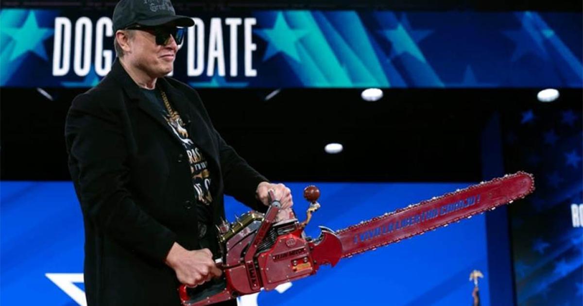 wearing sunglasses inside and following an event where he at times had a hard time speaking coherently, Elon Musk walks off the CPAC stage waving around a chain saw. this is the guy currently running our government. Congrats, America! pic.twitter.com/IwUZ8sZItS