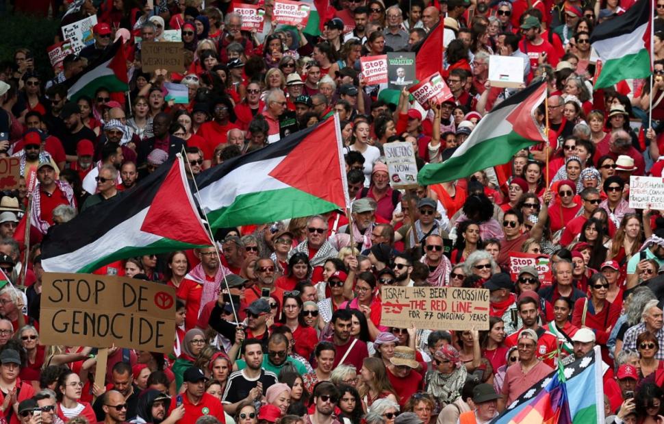 Ντυμένοι στα κόκκινα, δεκάδες χιλιάδες διαδηλωτές, συμπεριλαμβανομένων οικογενειών με παιδιά, κατέβηκαν σε δρόμους στην Χάγη σήμερα για να εκφράσουν τη διαμαρτυρία τους κατά την πολιορκία της Λωρίδας της Γάζας από το Ισραήλ, απαιτώντας από την ολλανδική κυβέρνηση να λάβει περισσότερα μέτρα κατά αυτού που οι διαδηλωτές αποκάλεσαν «γενοκτονία» στη Γάζα.