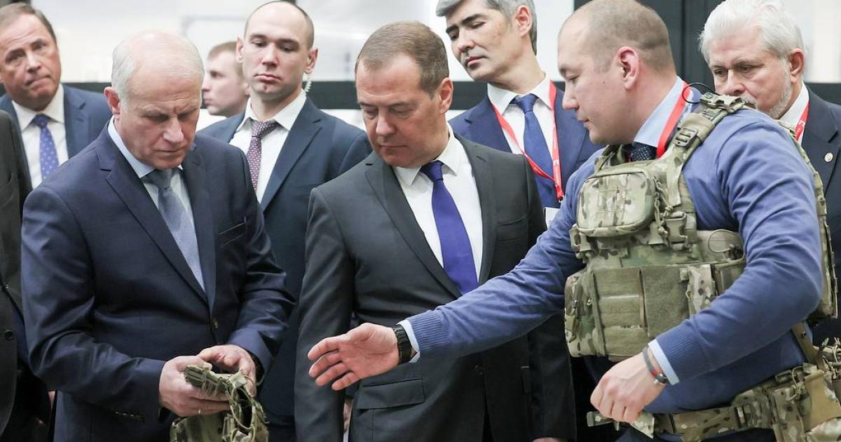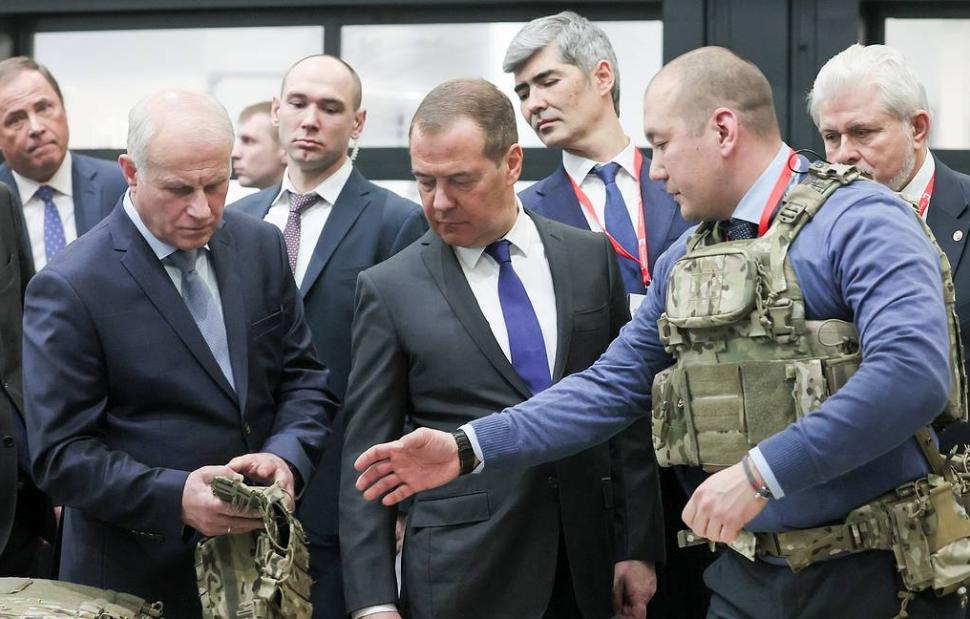 Σε βίντεο που ανήρτησε στο κανάλι του στο Telegram, ο Μεντβέντεφ φαίνεται να επιθεωρεί τουφέκια Καλάσνικοφ, οβίδες πυροβολικου, πυραύλους και μη επανδρωμένα αεροσκάφη (drones).