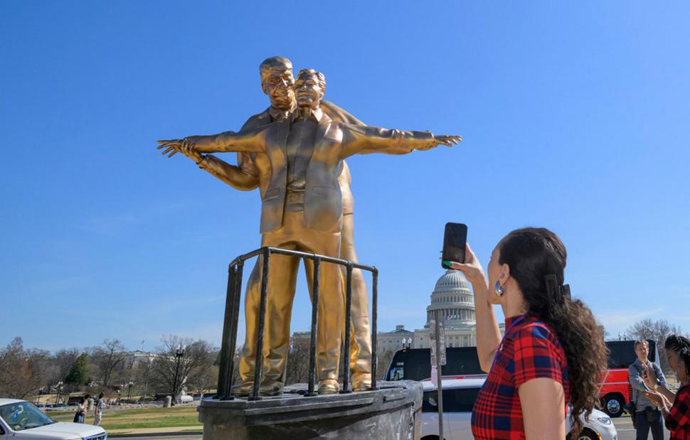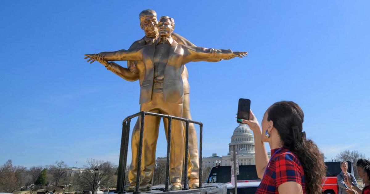 Το άγαλμα που μαγνητίζει τα βλέμματα στο National Mall δείχνει τον Τραμπ ως «Τζακ» να στέκεται πίσω από τον Έπσταϊν – ως «Ρόουζ» - στην πλώρη του Τιτανικού και να χαμογελούν ευτυχισμένοι, όπως το ερωτευμένο ζευγάρι στη διάσημη ταινία.