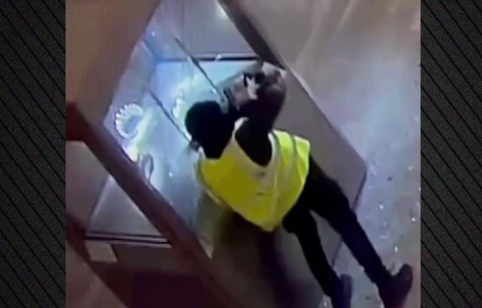 Φορώντας κίτρινο γιλέκο και ντυμένος στα μαύρα, κατευθύνεται στη συνέχεια προς τον συνεργό του για να τον βοηθήσει να διαλύσουν και δεύτερη προθήκη, προκειμένου να αφαιρέσουν περισσότερα πολύτιμα αντικείμενα.