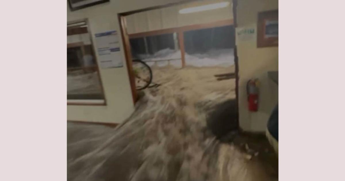 Το κύμα που εισέβαλε από την πόρτα, όπως φαίνεται σε βίντεο, προκάλεσε -ευτυχώς- μόνο μεγάλες υλικές ζημίες.