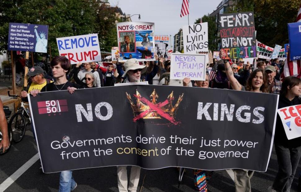 Οι διαμαρτυρίες ονομάζονται No Kings για να υπογραμμίσουν ότι η Αμερική δεν έχει απόλυτους ηγέτες, μια κριτική στον αυξανόμενο αυταρχισμό του Τραμπ.