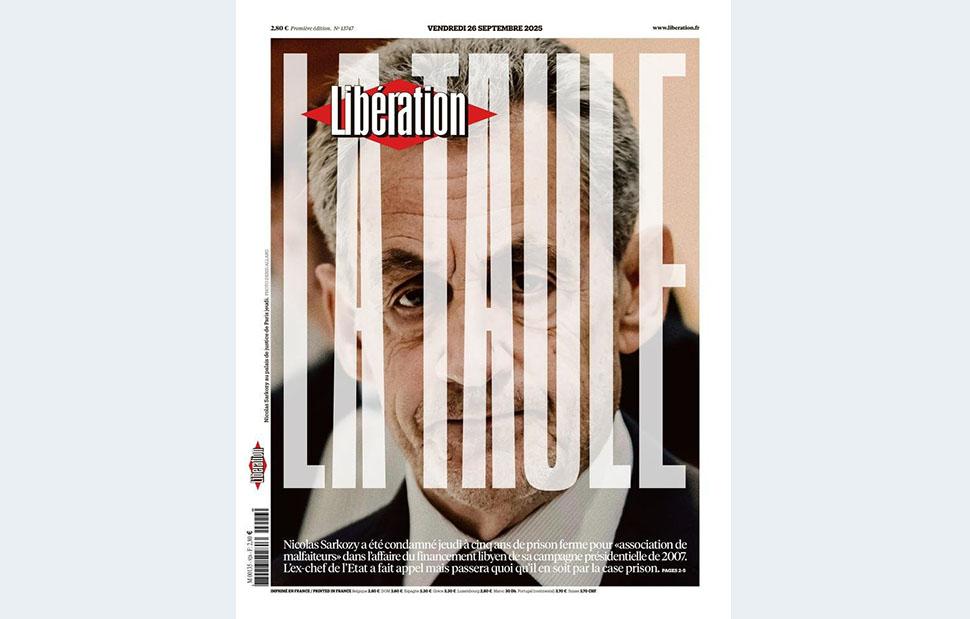 Δεν θα μπορούσε η καταδίκη του Νικολά Σαρκοζί να μην είναι σήμερα (26.09.2025) το κεντρικό θέμα των ενημερωτικών sites και των εφημερίδων (κυρίως) της Γαλλίας. Μέσα σε αυτά και η Liberation η οποία κυκλοφόρησε με μία φωτογραφία του σαν να είναι πίσω από τα κάγκελα: μόνο που τώρα αυτά τα κάγκελα είναι η γραμματοσειρά του τίτλου.