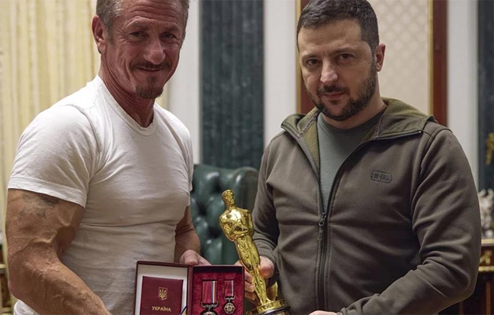 Ο Αμερικανός ηθοποιός Σον Πεν έδωσε το Όσκαρ του στον Ουκρανό Πρόεδρο Βολοντίμιρ Ζελένσκι κατά τη διάρκεια επίσκεψής του στην πρωτεύουσα Κίεβο. Το βίντεο που δημοσιεύτηκε στο κανάλι Telegram του Ουκρανού Προέδρου δείχνει επίσης τον πρόεδρο να απονέμει το παράσημο της Αξίας της Penn Ukraine.